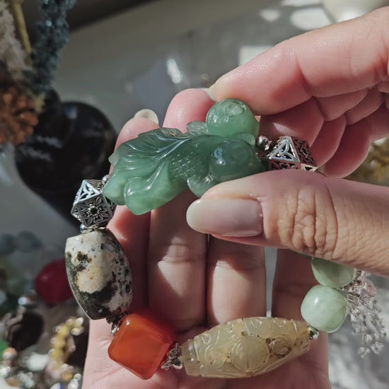 This one-of-a-kind bracelet is an elegant fusion of natural gemstones and symbolic artistry. At its heart lies a beautifully detailed green aventurine koi fish carving, representing perseverance, prosperity, and good fortune.